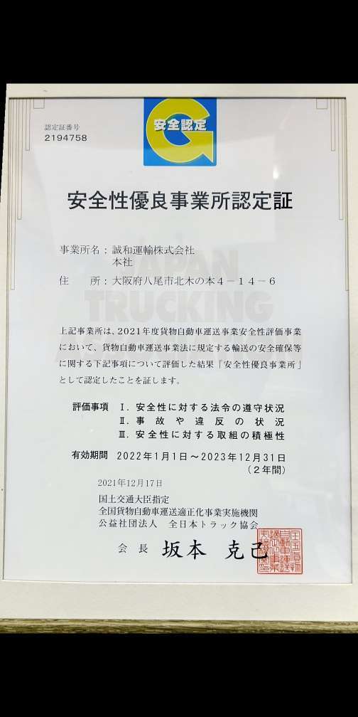 このたび、全日本トラック協会公認の「安全性優良事業所」に認定されました!