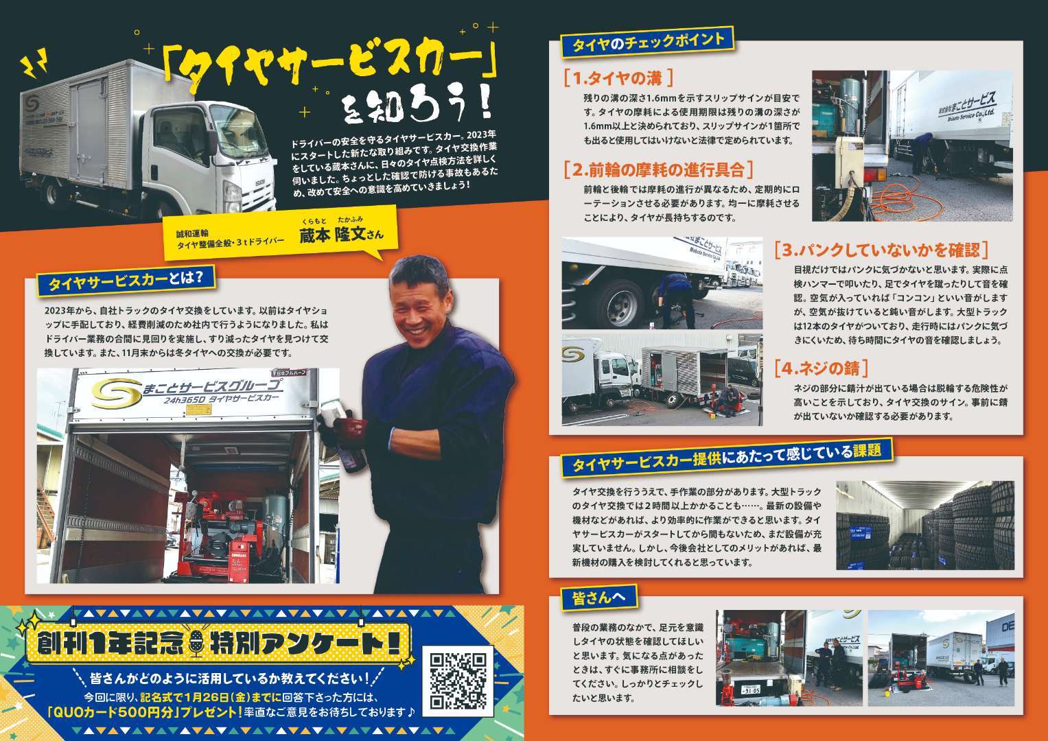 社内・社外のかた問わず、記名でアンケートにお答え頂きますと、もれなくクオカード500円分が貰える!といった内容です。誌面左下添付のQRコードから、2~3分程度のアンケートとなっています。ご意見・ご感想をどしどしお送りくださいませ!
